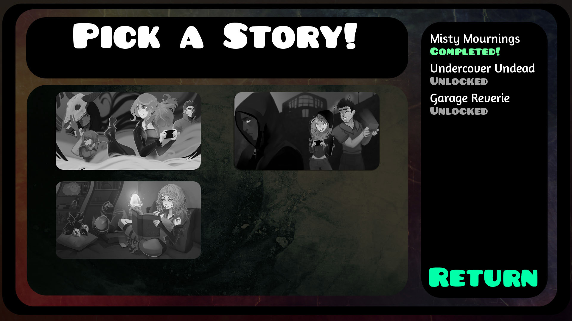 For this Halloween we'll be updating the game with two new episodes of spooky goodness! I managed to finish up a second story in time, and so you'll have access to an entire extra story! Undercover Undead and Garage Reverie are the two new episodes being added.