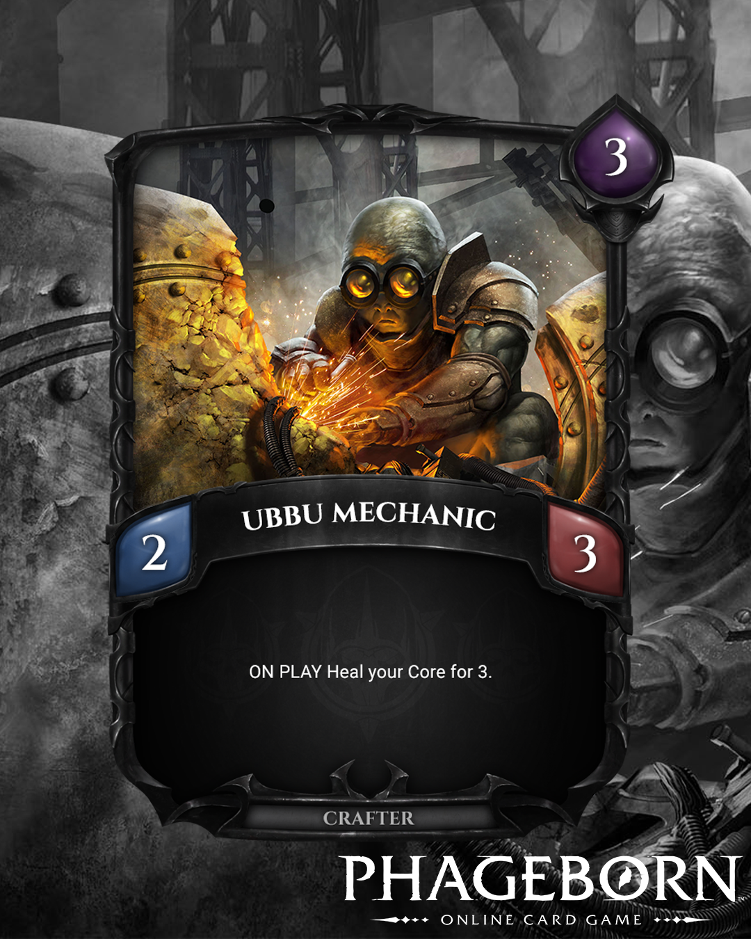 The Ubbu Mechanics, despite their diminutive stature, are no pushovers when it comes to battling in the PHAGEBORN battleground. These crafters, sporting a modest cost of 3, exhibit surprising resilience with a health pool of 3. They may not be physically imposing with a power of 2, but they more than make up for it with their invaluable skills. Upon joining the fray, their arrival alone is a boon, as they instantly heal your Core for 3, proving that even in the heat of battle, they're never far from their beloved machines and gadgets.