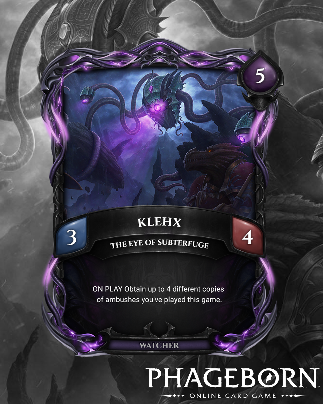 Klehx is not only a master of psychological manipulation but also a formidable presence on the battleground. With a power of 3, a robust health of 4 and only at a cost of 5 essence making him a formidable force. On play when Klehx enters the battle, he can obtain up to four different copies of ambushes that were played previously during battle. His formidable ability adds an element of surprise to his already mysterious arsenal.