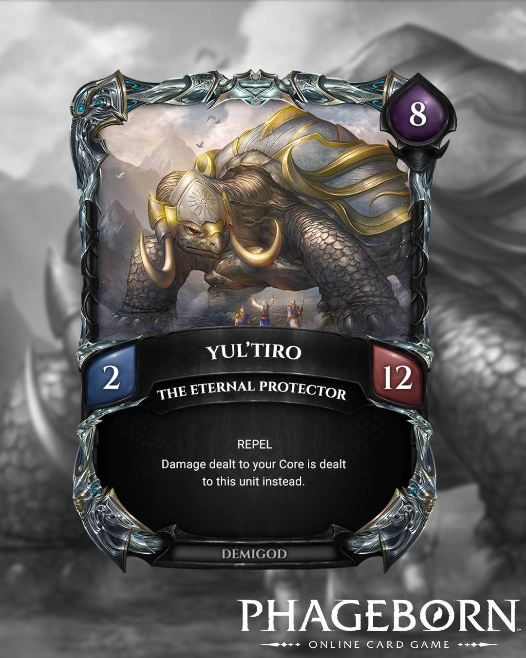 As a legendary demigod, Yul'Tiro possesses a power of 2 and a towering health of 12. Summoning Yul'Tiro requires a strong heart and unwavering determination. What sets this majestic creature apart is its unique ability to absorb damage intended for your Core. Any harm aimed at your Core is deflected onto Yul'Tiro, shielding you from harm. His formidable shell also repels any effects cast upon him by an ability card. Embrace the divine might of Yul'Tiro and let this extraordinary Divine Beast protect you on the battleground.