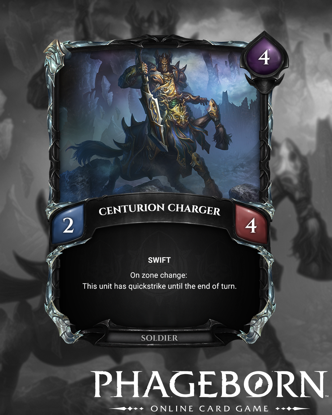 Centurion Charger is a 4-cost Ascended unit whose stats are set at 2/4. While it may not seem like the appropriate amount of damage for a 4-cost card, this unit gains quickstrike until the end of its turn whenever it changes zones. And, if you consider that this unit has swift as well, a whole new world of opportunities will open. Swift will allow Centurion to attack after it changes zones, gaining quickstrike in the process and allowing Centurion to deal damage before the retaliation damage applies, meaning if the Centurion kills the enemy unit while having quickstrike, it will not take any damage. All this makes the Centurion Charger a great unit to gain board advantage during early turns or for finishing powerful units with a sliver of health.