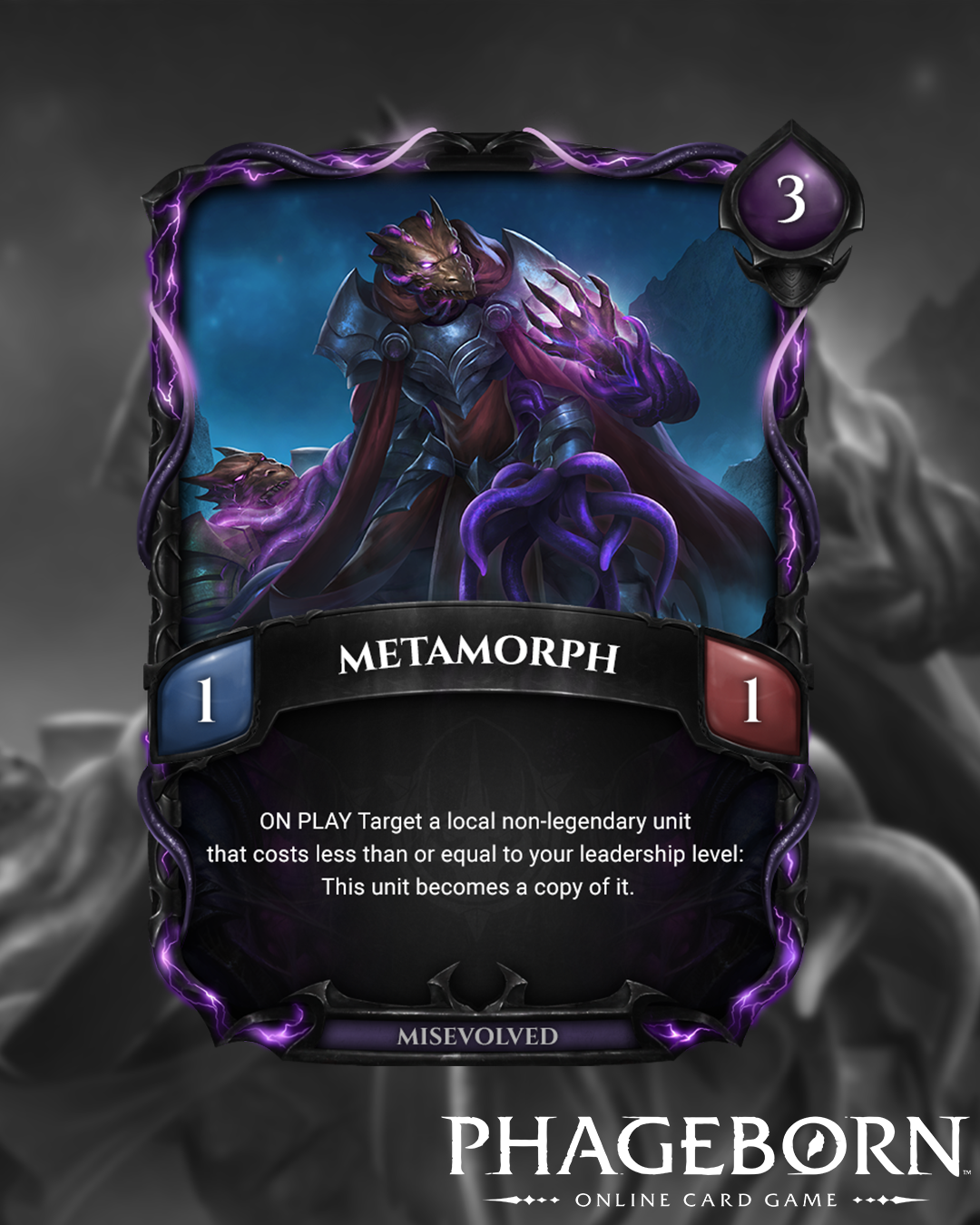 Metamorph is a 3-cost, power of 1, and health of 1, Oblivion creature. This card may seem weak at first glance. However, its ability is what sets it apart. When played, Metamorph targets a local non-legendary unit that costs less than or equal to your leadership level and then transforms itself into a copy of it. This ability allows you to duplicate a valuable unit from your deck or your opponents, making it a great card for controlling the battleground and creating powerful combos. Just be careful to choose the right target, as the copied unit will not copy any buffs or debuffs the original might have had.