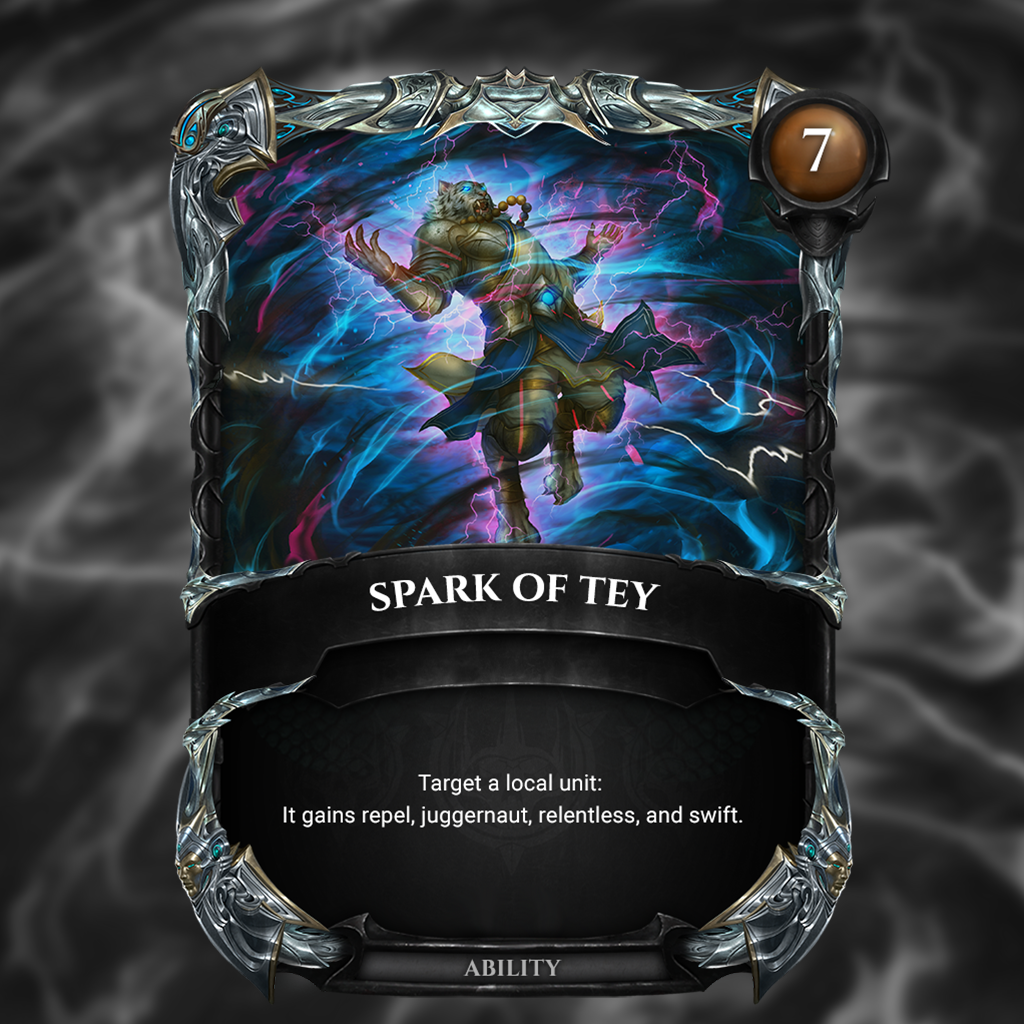 SPARK OF TEY "Channeling the full might of Tey can make one incredibly resilient and nimble. Well, for some time. That power has to be fueled by something, and once it's gone, you're left worse for wear. That's why I train to rely only on myself." - Shima Tey'Siro, also known as The Solar Flame, is one of the Divine Beasts whose influence on the Ascended was so impactful that they've created a whole philosophy from its teachings. Tey'Siro taught the Ascended how to fight with a fury so intense it matched the power of the stars. That's why the Teachings of Tey, also known as the Teachings of the Sun, hold offence in high regard. Those who are well-versed in the art of Tey, are even able to draw power from that dark, violent part of their soul, and with it, considerably improve their fighting capabilities. However, the power of Tey is strong and shouldn't be underestimated. Using such advanced techniques takes its toll on the body as well, burning through even the Ascended's ascended physique. Spark of Tey is a legendary ability card from the Ascended faction. For 7 energy you can target a local unit and it will gain repel, juggernaut, relentless, and swift. To make the maximum out of it, use it on a unit with high stats. Swift will allow the unit to remain ready even after its move action, with juggernaut, excess damage from your attack will be dealt to the enemy Core, and relentless will unexhaust that unit at the start of your enemy's turn so you don't have to worry if you'll have a blocker ready. All the while, thanks to the repel, it can't be targeted by ability cards, making it even harder for your opponent to destroy it. Pretty good combination, wouldn't you agree?