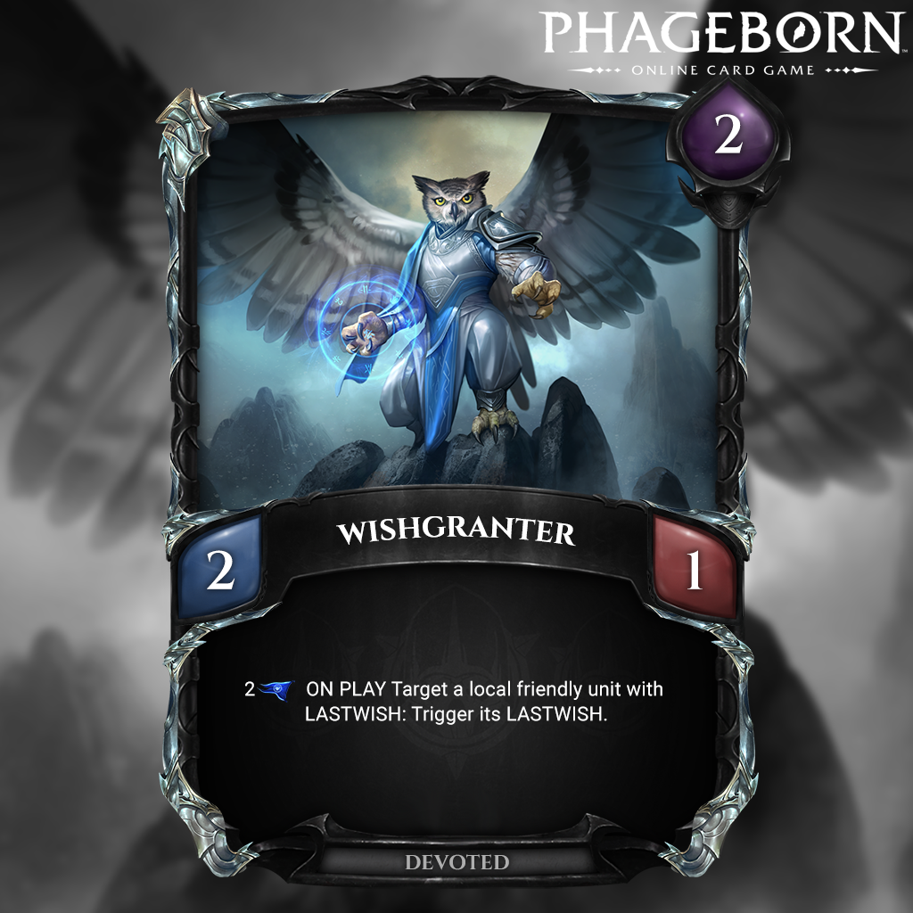 Wishgranter is a 2/1 Ascended unit that costs 2 essence. Even though its stats aren’t that great, its effect makes a Wishgranter a great card to have in your Ascended deck. If you have at least 2 points in leadership when you play this card you can target a local friendly unit with lastwish and trigger it without destroying the card.