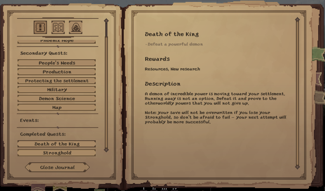 -Reworked the encounter system - now "easy" encounters appear only at the beginning of the game, and "hard" encounters appear in the middle or later -It is no longer necessary to release settlers from their jobs to send them on a mission or to a hospital -Increased the attack speed of almost all demons, but reduced their damage -Increased the movement speed of all demons -Reduced the cost and increased the strength of the Iron Ballista -Reduced the Mannequin cost -Slightly improved graphics and sound during the boss arrival -Changed requirements for upgrading productivity artifacts -Slightly reduced the effectiveness of the deceleration artifact -Workers no longer auto-repair traps at night -Increased the movement speed of all settlers -Changed the spawn conditions for some demons -Various UI improvements