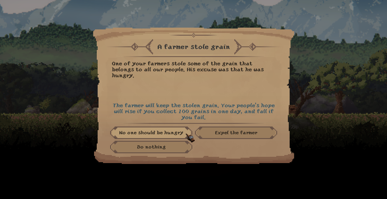 In "Update 0.3 - The Hero", random events will occasionally happen in your village, where your choices will determine the fate of the villagers or even your entire settlement. Some decisions will cause you to receive quests that take one to several days to complete.