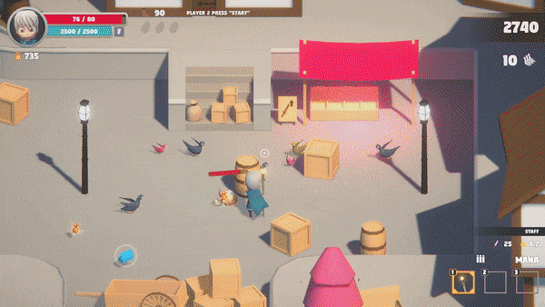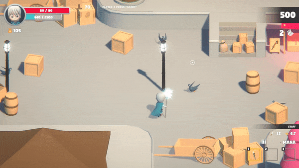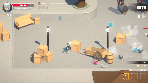 Ron uses magic staffs as weapon (don’t you say). You can find different staffs on different spots of the map, each one with a specific power. They all work in a similar way: press the attack button once to shoot and hold it for a while (until you hear a sound or see your staff glowing) to shoot its special power, as you can see on the gifs. But be careful, all your shots consume mana (blue bar below health). The amount of mana consumed depends on which staff you are using and if it is a normal or a special shot. You can recover your mana by defeating enemies, picking ammo boxes, buying mana potions or just waiting, as it recovers a bit every second.