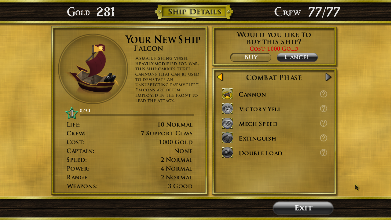 Previously when you purchased a ship, you didn't have much to go on to help you make your decision. Considering how important gold is and how much ships cost, you would think that the opposite would be true. With this update, when you go to buy a ship, you'll find your self in the Ship Details screen with a complete look at all the ship's stats. You can even look at all the actions that the ship will be able to get. Actions that the new ship won't have immediately are in black and white. Hopefully this should help make it easier to commit all that gold to a new ship.