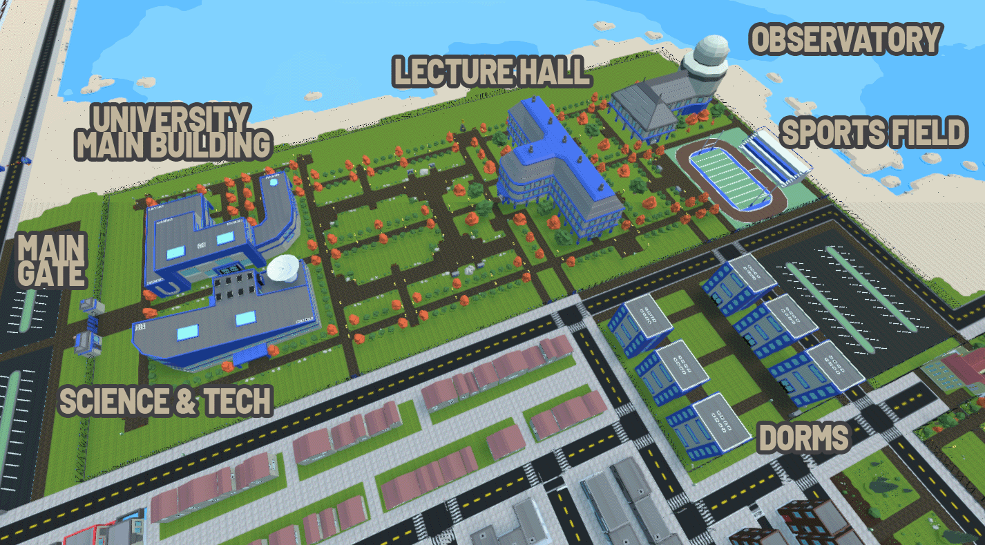 We're excited to announce the latest area in Pity Please! - a brand new university campus in the island town! The campus includes the main building, which is the heart of the university, as well as three other buildings - the lecture hall building, observatory building, and science & technology building.