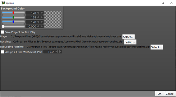 After enabling this branch, you will have the option to specify versions to use for the Player, Runtine, and Debugging Runtime components. Player: This is the version of the Player component used when performing a test play via the PGMMV editor. The default version is the normal Player component installed with PGMMV’s editor at (install folder)/player-win/player.exe.