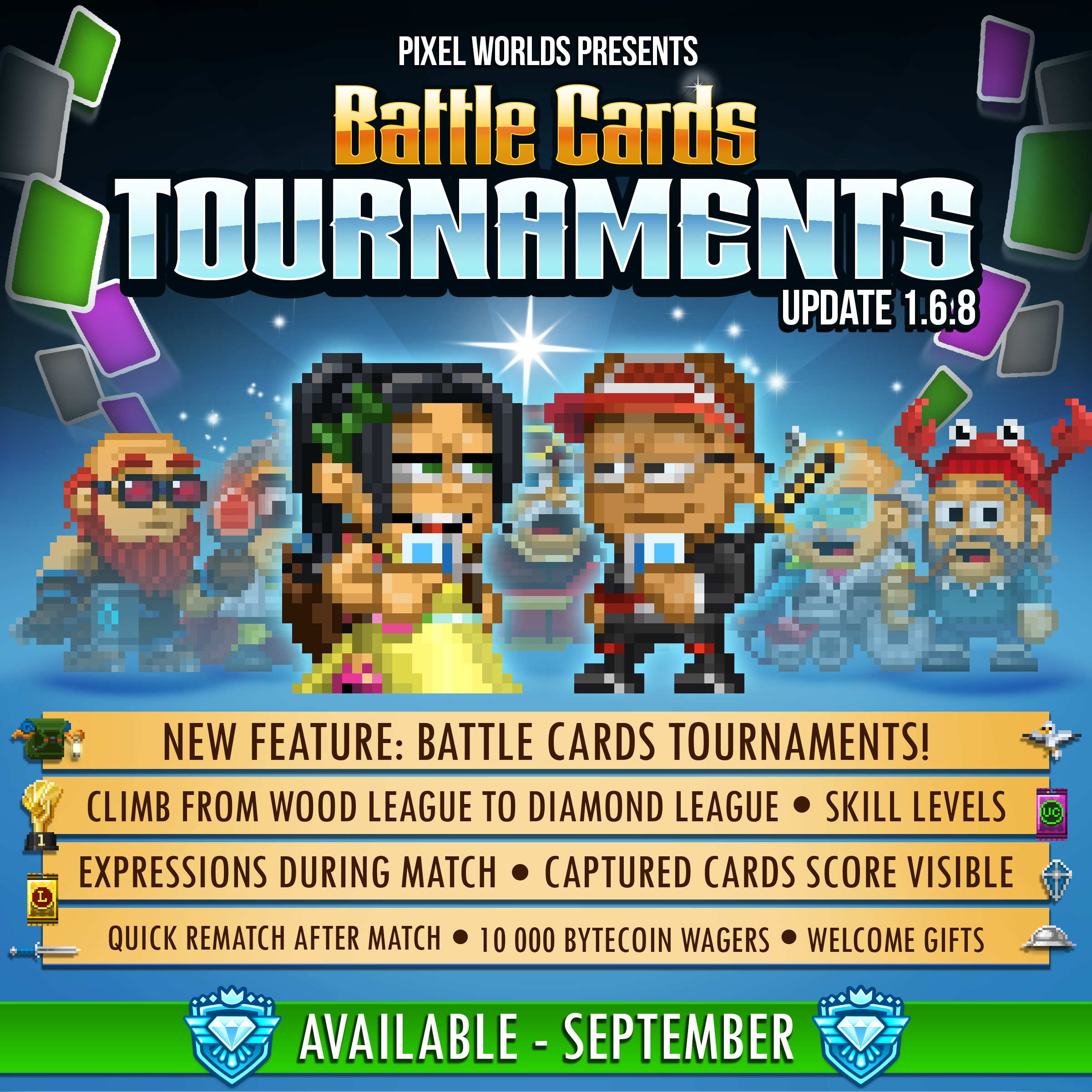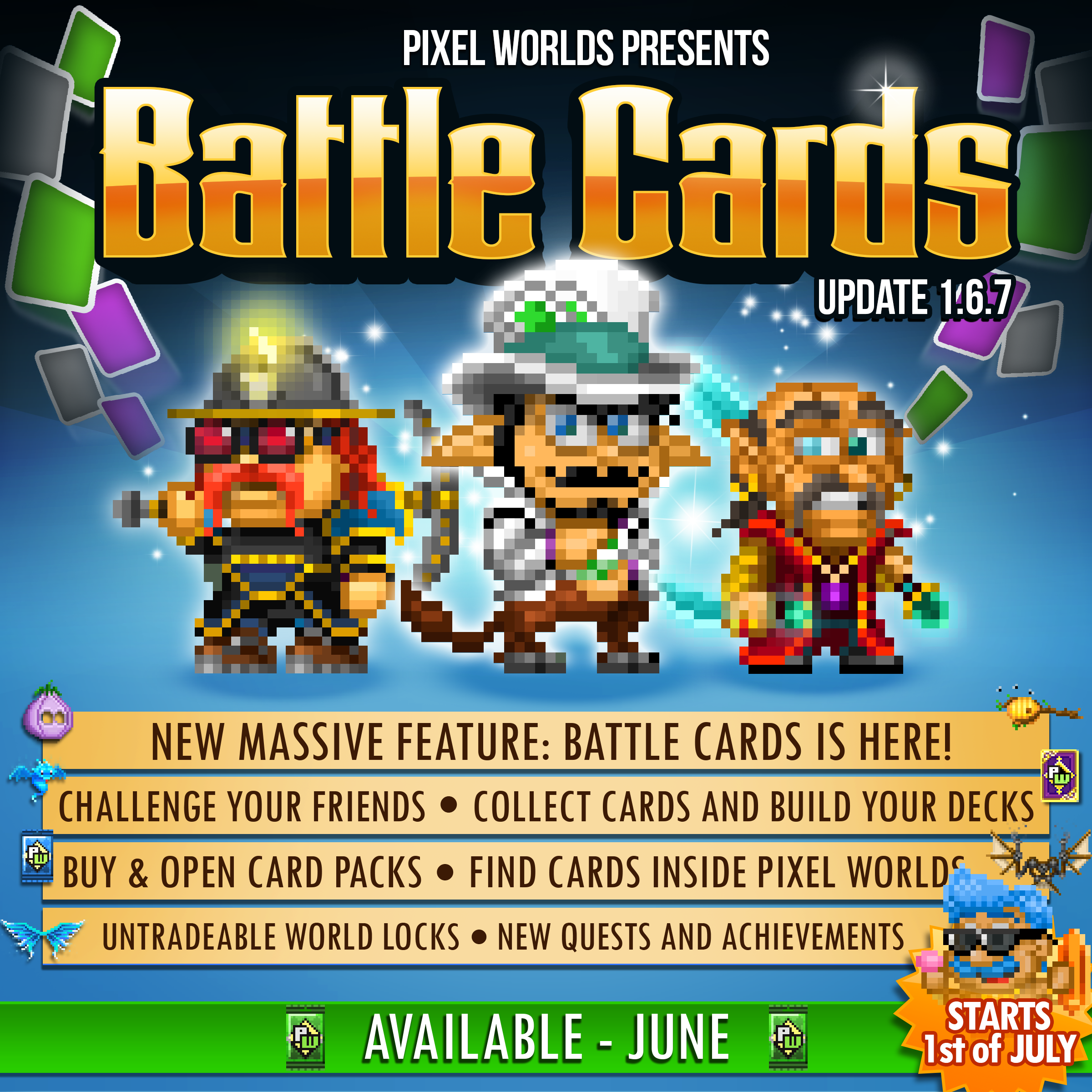 - New massive feature: Battle Cards! - Grow your personal card collection and play against other players! - Explore Pixel Worlds to find rare, tradeable cards! - Summer events return in July: Collect ice-cream for unique quest rewards! - Flowers of Summer event every weekend during July and August! - See your win rate in Best Set contests! - World Locks become untradeable! - Convert your locks to Byte Coins with a temporary, better rate!