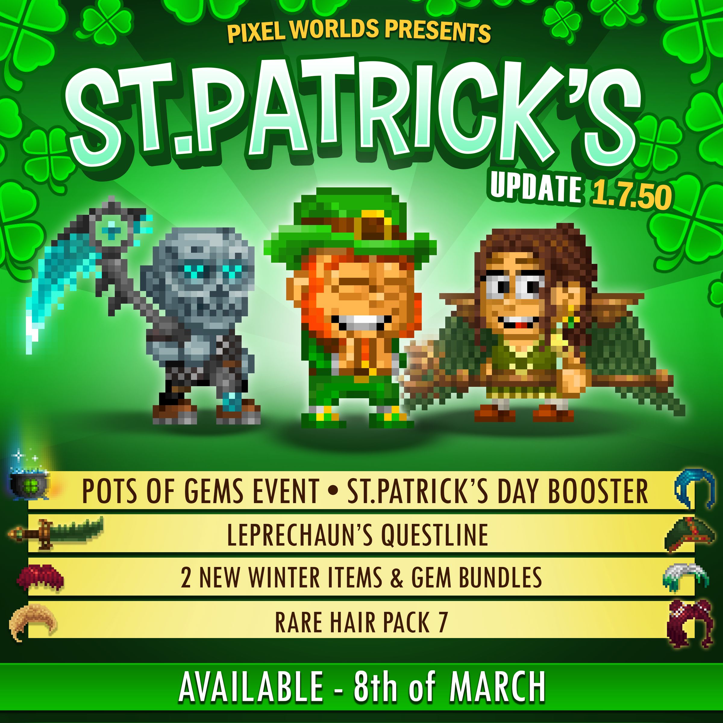 - St. Patrick's Day events are back for limited time! - New limited time IAP bundle items: - Harbinger Mask + 75K gems - Winter's End Scythe + 300K gems