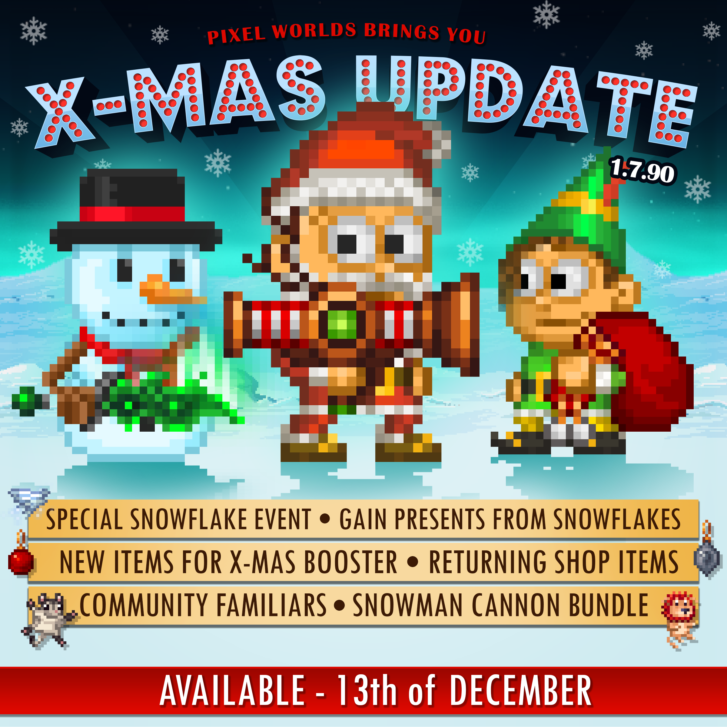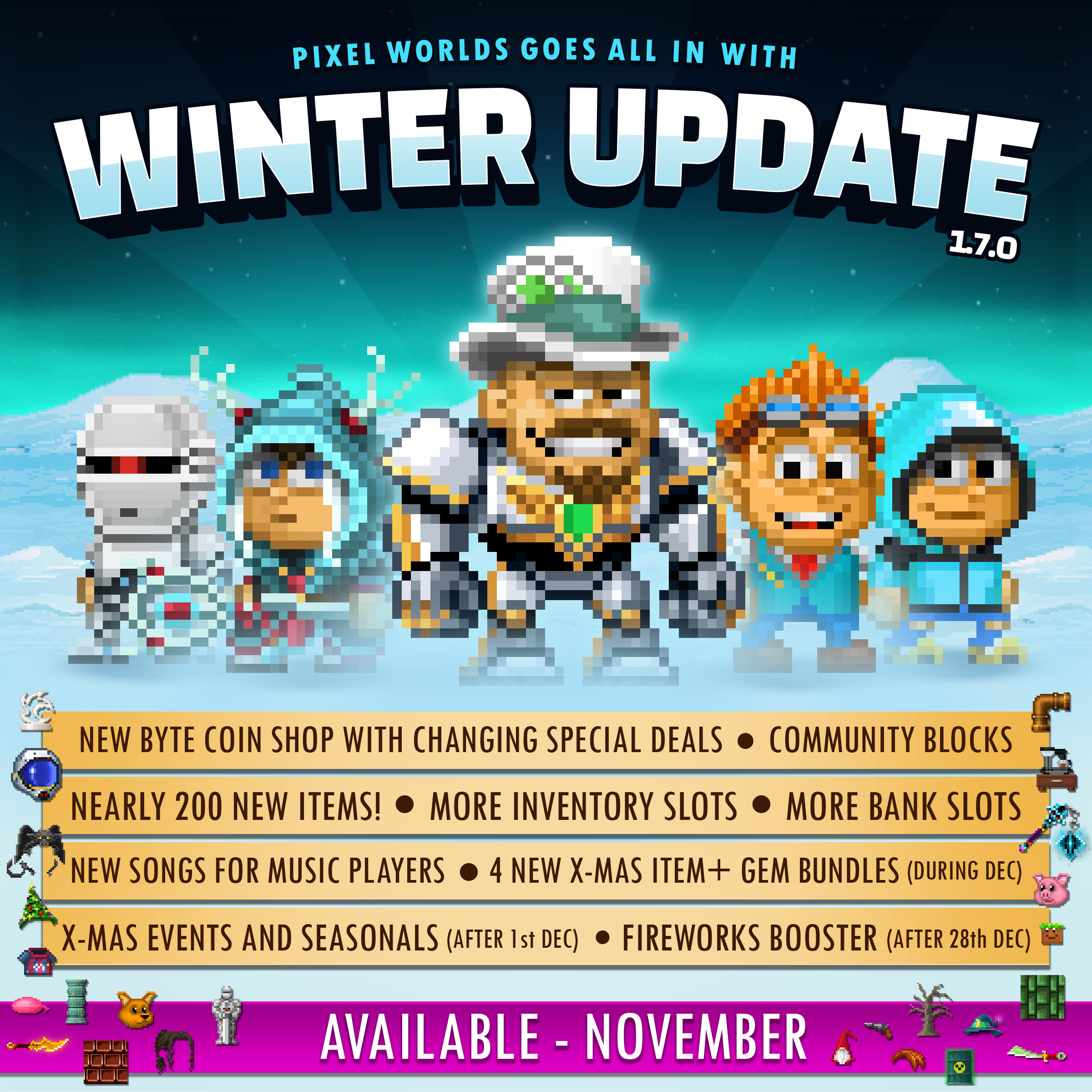 Winter Update! -Almost 200 new items -Get new presents from the Snowflake event -New X-Mas booster items -Winter Orb and Pack -Fireworks booster (after 28th) -New Byte Coin shop -More bank and inventory slots