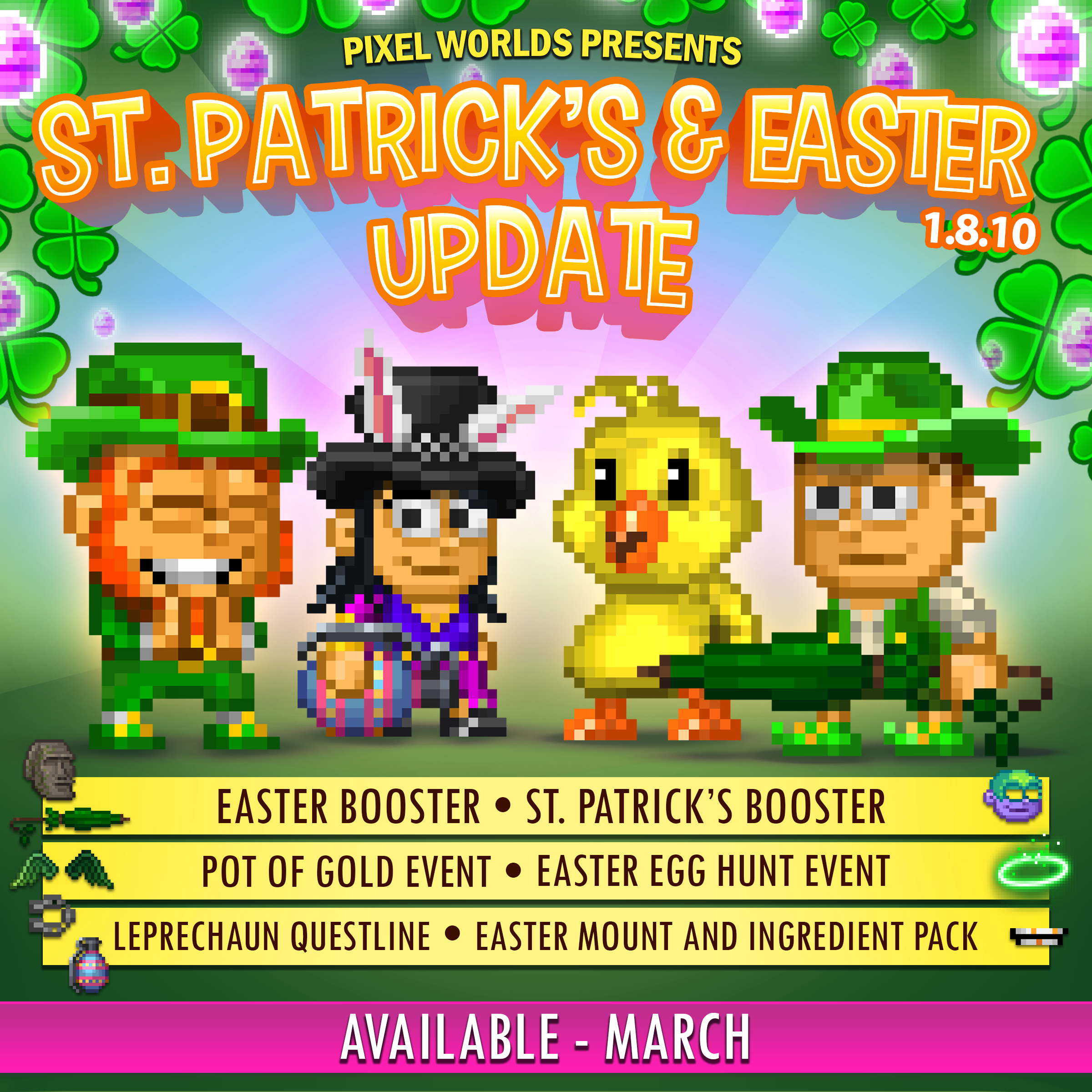 - St. Patrick's Day events are back for limited time! - Easter fun begins on the 20th - Easter Booster with new items! - Easter Mount (For sale during the Easter Event)! - Easter special event: Find Easter Eggs to get rare limited time items and gems!