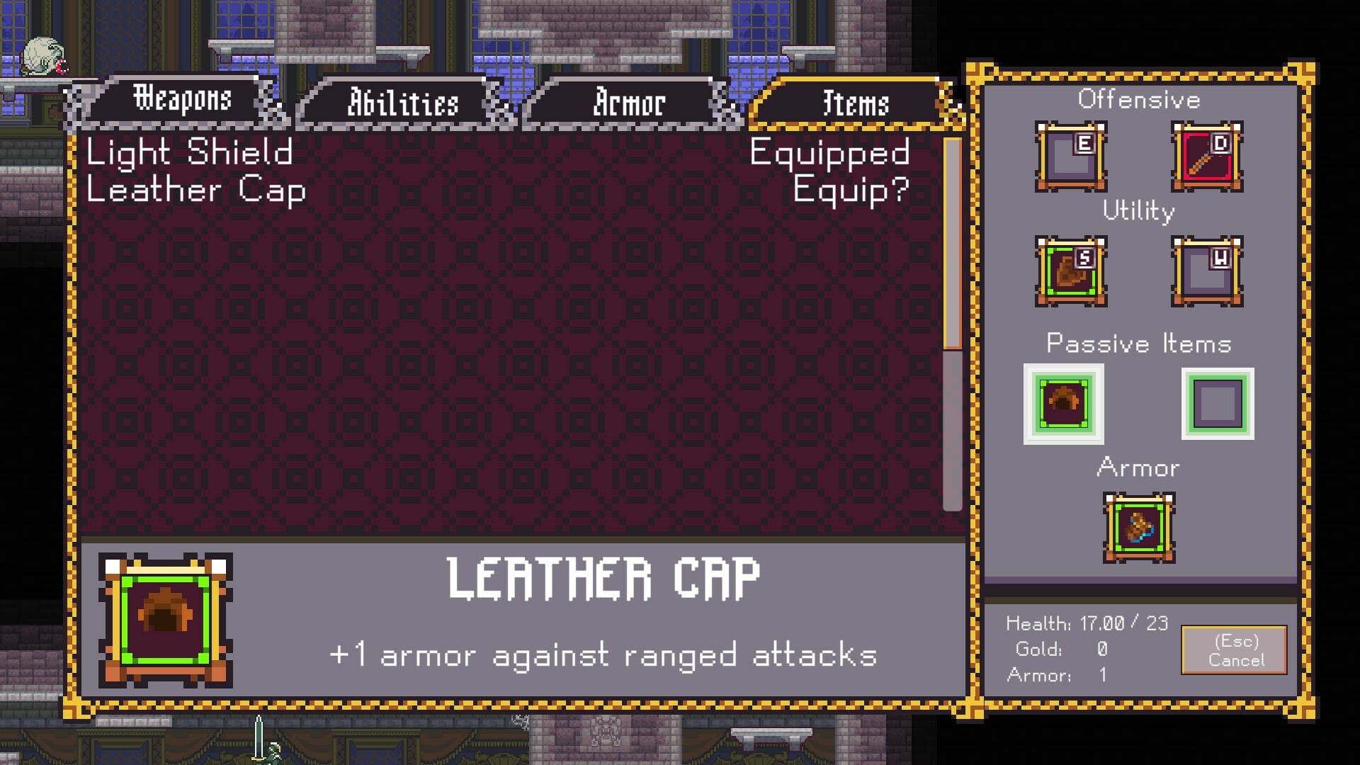 Leather Cap: Gain +1 armor against projectiles Warrior's Belt: Gain Armor, Damage and self heal. Tougher enemies appear much more frequently
