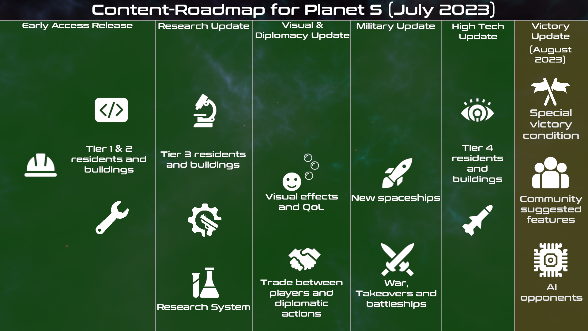 We are still hard at work to get the Victory Update ready is month. We thought this state of the game would be a good time to share how the new victory condition that will be introduced with the Victory Update will work. The "Military Victory" is the first option to win the game and the "Science Victory" will be the second one. The military victory will be a simple domination victory which will be triggered if you are the last faction that is still alive. The science victory on the other hand is a little more complex and it consists of the following steps: