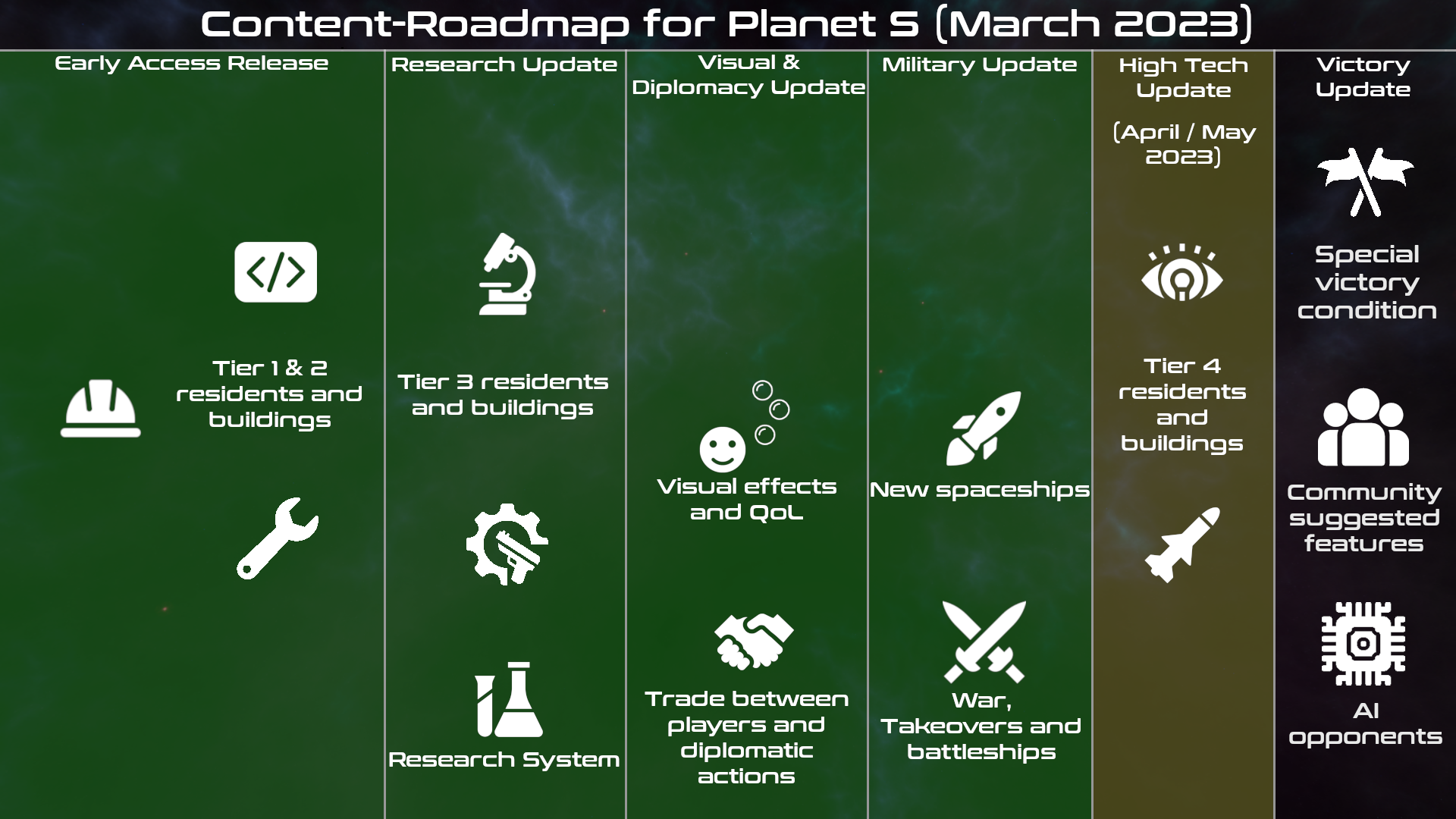 Planet S has now been in Early Access for 1 year or in other words: Planet S was released 1 year ago! This time we want to give you a look at the big features we are working on for the last big update before the full release, the Victory Update!