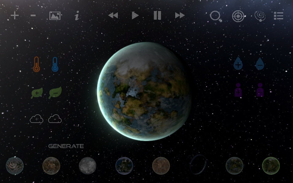 New Terraforming Planet types. Control the planets temperature, fertility, water levels and more. Beautiful atmospheric planets with varied conditions such as artic, barren, desert, jungle, toxic, continental planets and more!