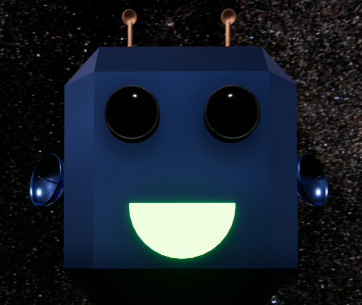 Here is my new proposed design for Blue 42 (at least his head). What do you all think? I am possibly thinking of adding solar panels to his head, and possibly making his mouth square with green "signal lines" going across. Do you like the lit up smile better, or think a square mouth with moving lines might be better? Does it look too childish / would it turn off an adult from playing? I want the game to appeal to both children and adults, though it is okay if it appeals more toward kids, while not turning away adults. I plan to use the image in game art, when Blue 42 is talking, and use the model when customizing the character. I look forward to your comments and suggestions for how I should change this model (or keep it just like it is) on this post!