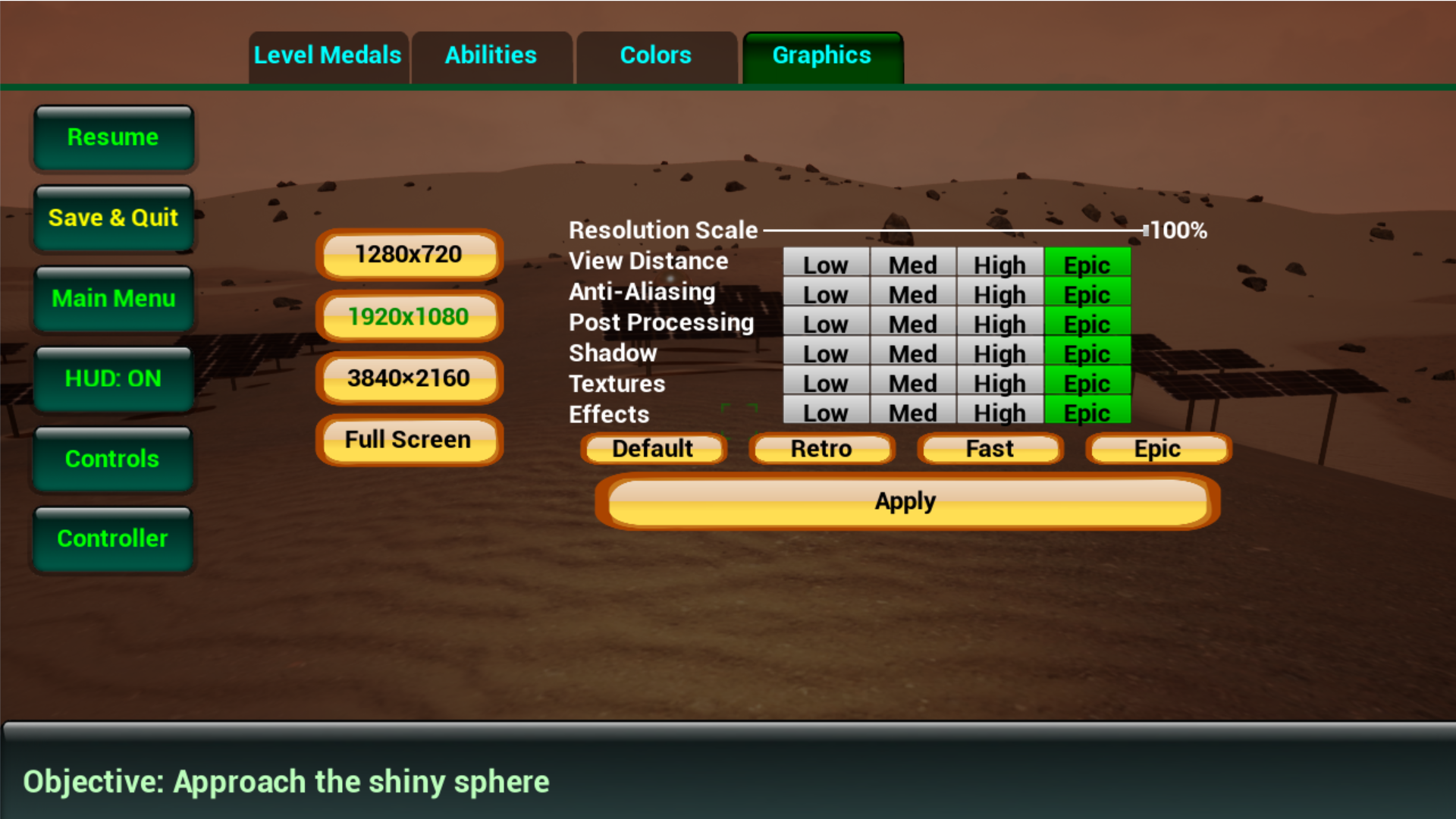 (Fixed) It was brought to my attention that there is a graphics bug where the graphics settings default to the lowest level, and I am making this release mainly to fix this bug. A workaround if you are currently playing is to go to the graphics tab and set the graphics higher, crank the resolution to 100%, then hit Apply. I am working to fix this quickly.