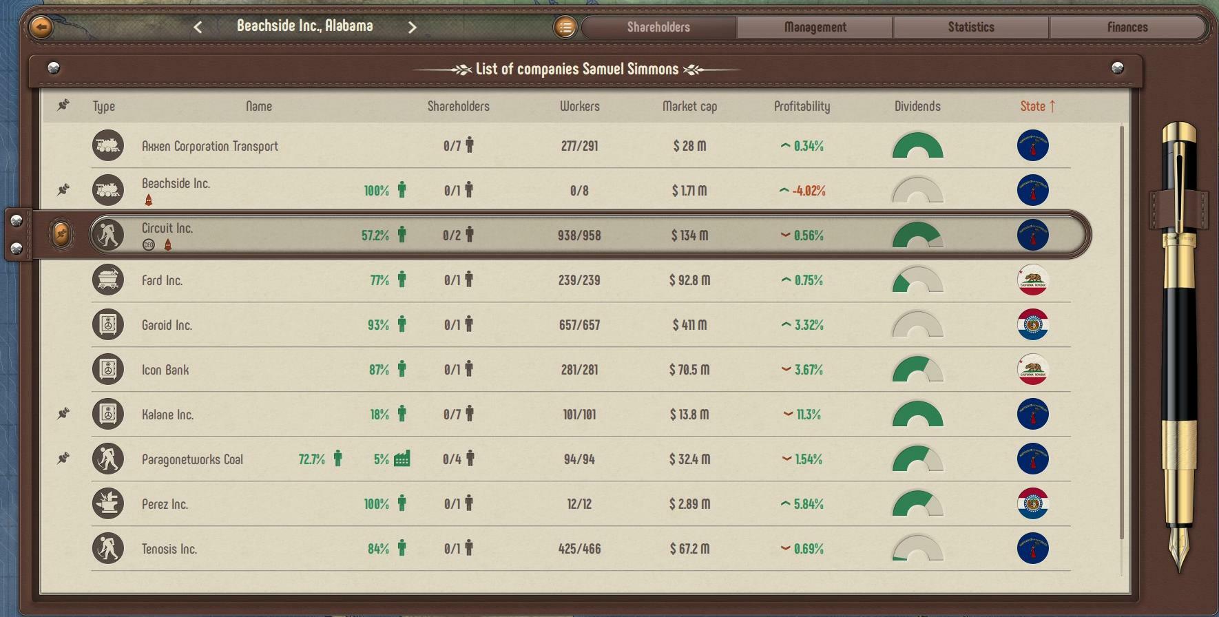 Now you will be able to see and analyze your entire structure of companies, the ownership shares of each company, all their daughters and granddaughters. This is especially useful in the late game, when there may be a lot of companies or you have formed an extensive and complex company ownership structure.