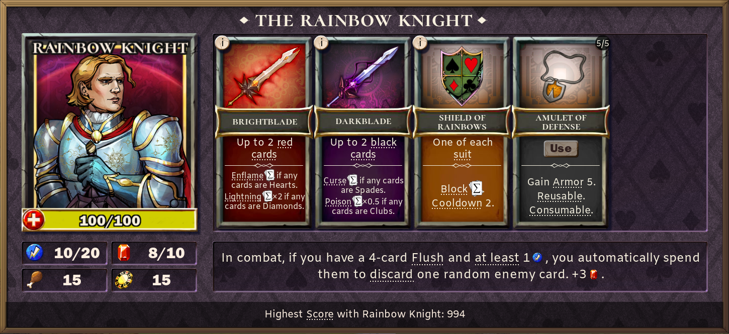 * NEW HERO: The Rainbow Knight! * Phoenix can be killed by Enflame once again. * Corrected texts on some items (Holy Mace, Splendid Sword of Thunder, Splendid Axe of Flame, Dark Warhammer of Pairs) and Wildsmith. * Multiple camping tents can now be used at a given node (including camp sites). * Scroll of Greed can no longer be used without first having enough max life. * Changed some items (particularly stashes) that had inconsistent enchant conditions. * Bless should now work correctly with certain status effects (like Hex). * Shieldbash should now deal the correct amount of damage when enflamed. * Items with Lock should now refresh correctly after revival. * Stunbolts will now correctly stun when next lightning is at 20%. * Enchantment texts should now show the correct values during Sudden Death. * World modifiers that cause specific cards to be drawn will no longer draw those cards if they are stashed. * Increased the size of the preview cards for the Foresight mechanic. * Gargoyle's Armor mechanics should now work properly. * Explosive mechanics should now correctly deal Fire damage. * Monsters that steal resources should no longer do so when enflame should have killed them first. * Item Smash mechanics should now ignore consumables. * Lightning should now be correctly be affected by the world modifier "Strong Attacks." * Item bonuses should now work correctly with the "Slow Items" Challenge. * Spirithorn should no longer cause unexpected deaths during the "Queen of Spades" world modifier. * Multiple actions can no longer be bound to the same key (which could cause crashes). * Fixed a crash related issue caused by Mixturedraw. * Fixed a crash related issue involving the confirmation checkbox when applying status effects. * Fixed some issues related to Achievements that caused some of them to be unachievable. * Fixed an issue that prevented importing saves. * Fixed a tutorial related bug.