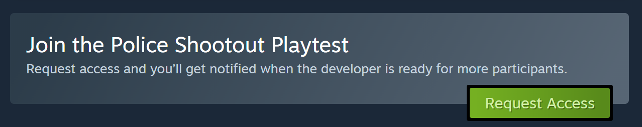 All players who signed up for Police Shootout: Prologue Playtests have been granted access! What next? You must check your email, maybe an invitation to participate in the Police Shootout: Prologue Playtests is waiting for you! We hope you are as excited as we are! The e-mail must be linked to the Steam account you requested to participate in Playtest.
