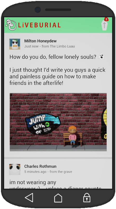 Make ghost friends by steering the living into deadly hazards to release their souls. Puzzle through diorama-style levels and make as many friends as possible using comically fatal accidents. Keep up with the latest memes by getting popular on the afterlife's hottest social media app, LiveBurial. Get a unique look at the dysfunctional, hyper-consumerist world of the living through the posts of your social media-obsessed Polter Pals.