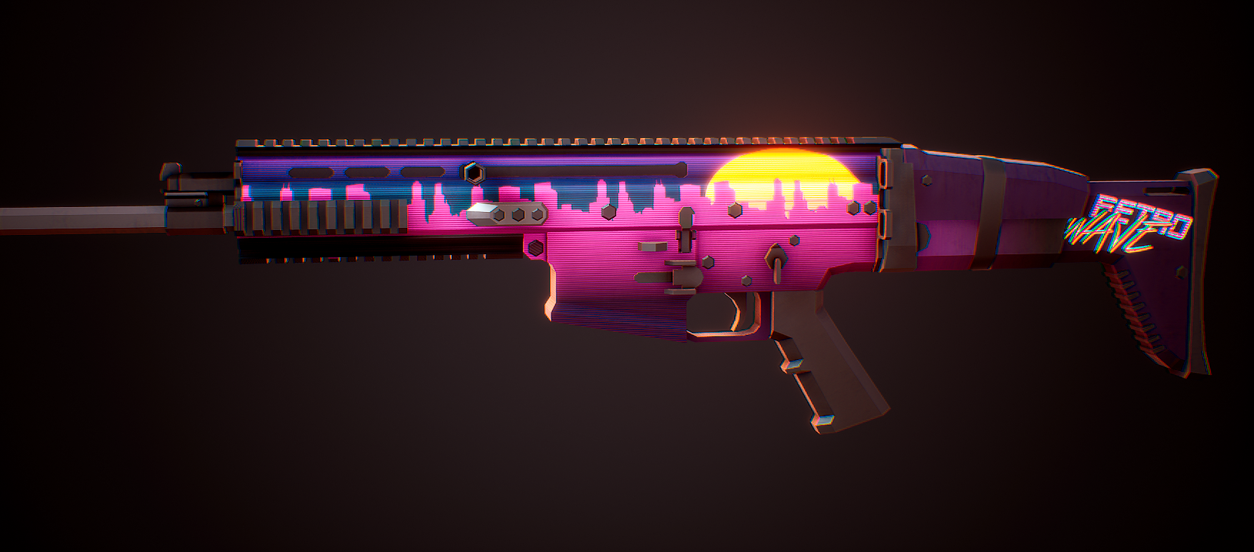 If you've seen the original post about this goal, you will notice that it is not the same skin, that is because with the recent changes to the weapon models, the original skin could no longer be used. But fear not, we came up with something even better: Retro Wave Scar-H