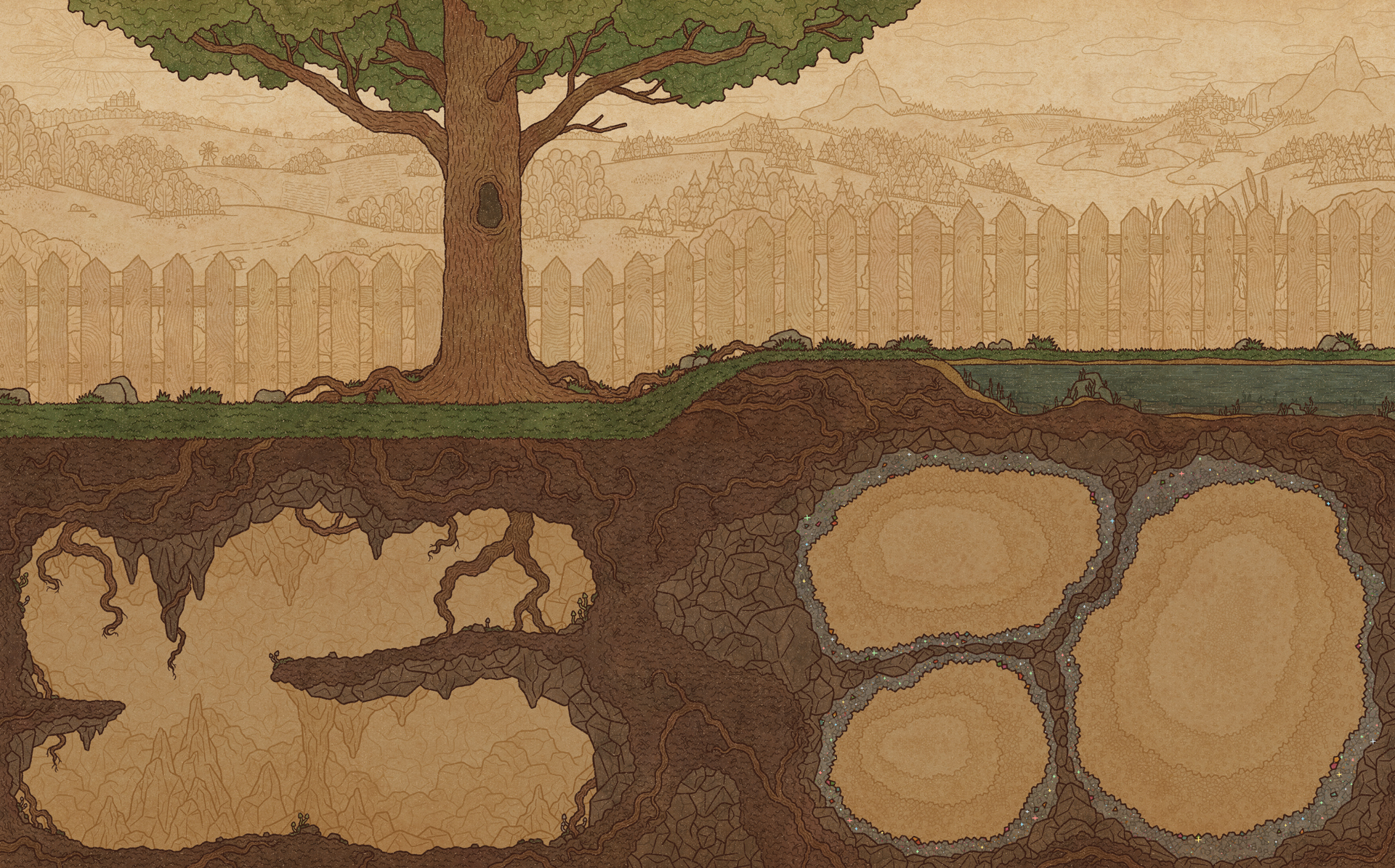 To the right, a pond has appeared, where water plants can be cultivated. On the land in front and on the distant shore, the same plants as in the garden next to the tree can be grown. Moreover, excellent conditions have formed underground for growing truffles!