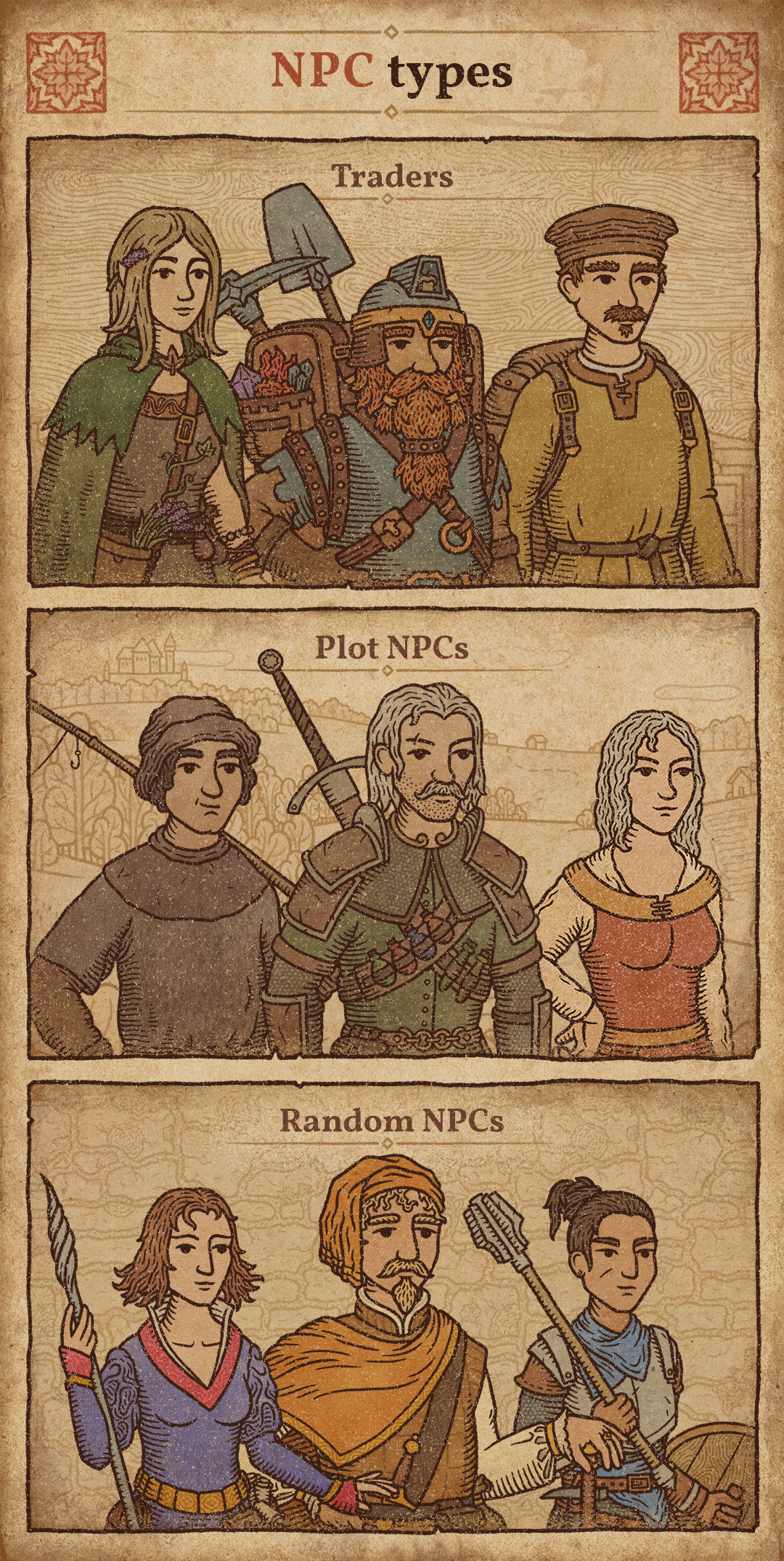In total, there are 3 types of NPCs in the game: traders, plot NPCs and random NPCs. Let's check them out in order.