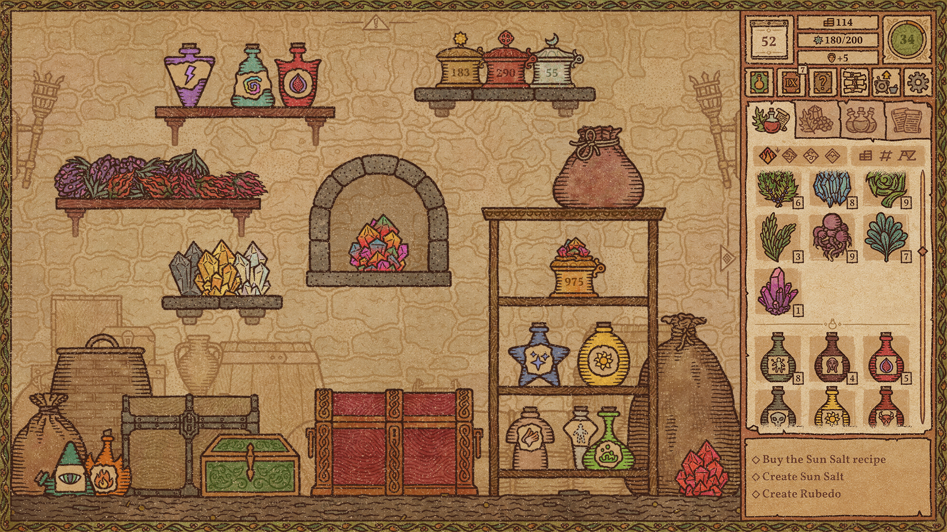 Picky clients, lack of ingredients, a blank recipe book – these are problems any amateur alchemist has to deal with. But hard work and diligence pay off eventually as the shop’s popularity increases and clients come more often who are willing to pay handsomely. With a copious amount of customers comes an abundance of ingredients and potions that need to be stored somewhere! Therefore, a successful alchemist might want to expand the shop and arrange a treasury for storing the most precious ingredients and trophies!