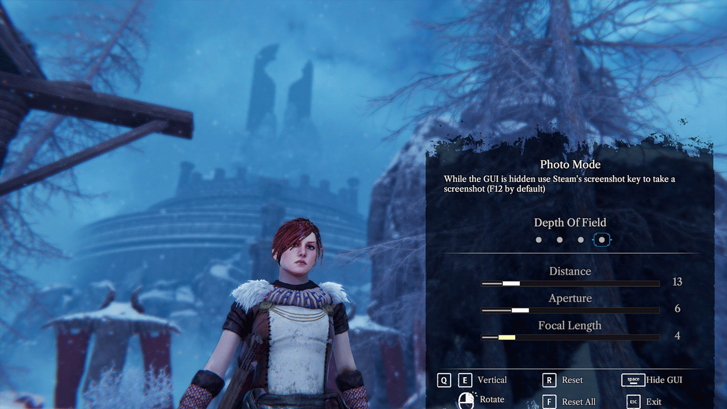 Photo Mode Photo Mode offers many options to help you take your photos to the next level. With settings for camera controls, post effects, color grading, and depth of field the direction you can take your photos in is vast. Photo mode ties in seamlessly with Steam's Screenshot system so simply jump into photo mode, setup your shot and press F12!