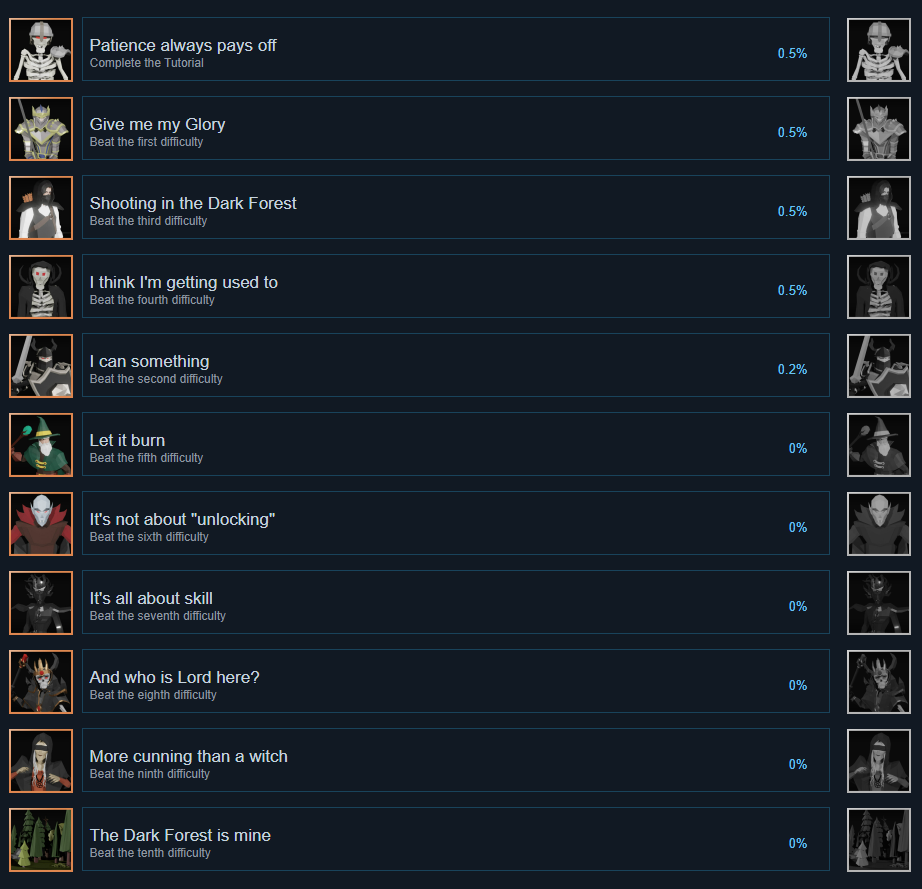 1) Now, there are 11 Steam achievements - for tutorial and every difficulty level. 2) Every time you complete the game, you get your scores - 1 for every kill and 1000 for every difficulty level. Your best scores will be saved on leaderboards, and you can compare them with yourself, friends, and other players.