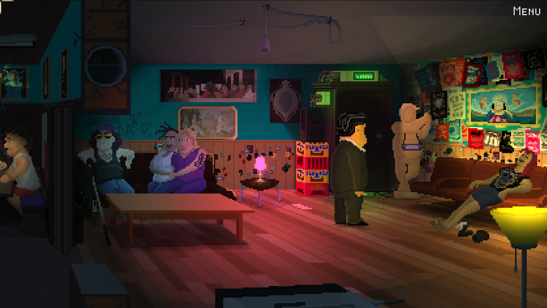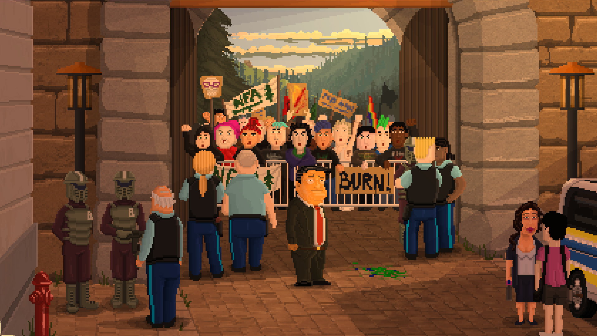 The two playable characters have slightly different playstyles. Don’t worry though: It’s all classic and intuitive point and click gameplay with a few extras. Lloyd will directly address you (House of Cards style) from time to time and the way you treat and talk to him will have consequences on his behavior and possibilities throughout the game. Liv on the other hand has a little cyborg squirrel that you can control! Wait a second… Doesn’t that actually make three playable characters? Hm. Never seen it this way…