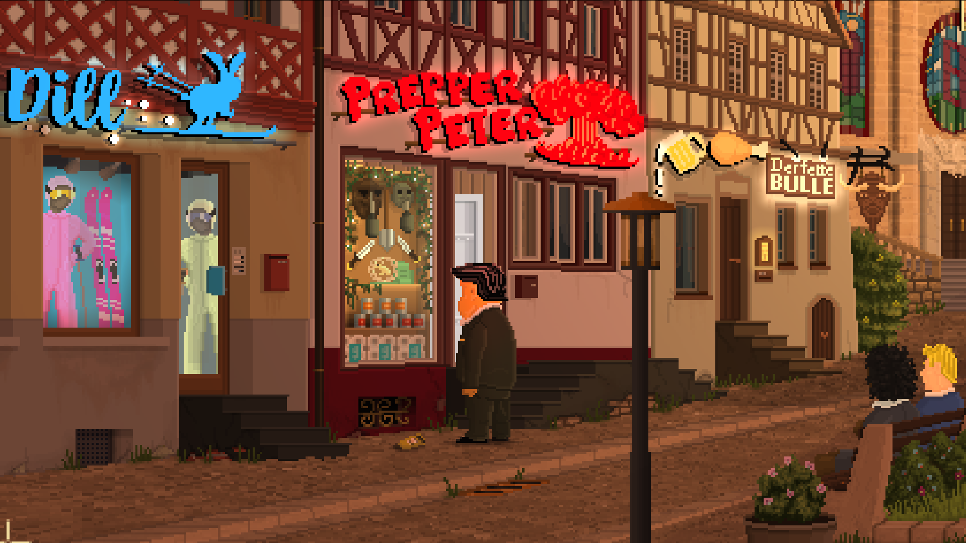 Our world map is also working and now connects all of the different locations in the game and we also have finalized the standard animations of our second playable character, which is awesome to see! Since the last update we’ve added quite some finalized art to the world, but there’s still quite a long way to go. We want to have a nice variety of locations for you to explore. Outdoor locations, german smalltown flair, secret bases and much more!