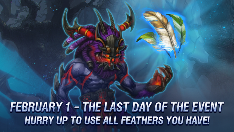 The event will last until 01.02. 🕒 23:59 UTC 31.01 is the last minute you can get Harpy Feathers via in-game methods. Harpy Feathers you’ve already collected will be stored on your account for 24 hours. 🕒 Until 23:59 UTC 01.02, you will be able to use remaining feathers to spin the wheel. 🕒 After that, feathers will disappear from your account