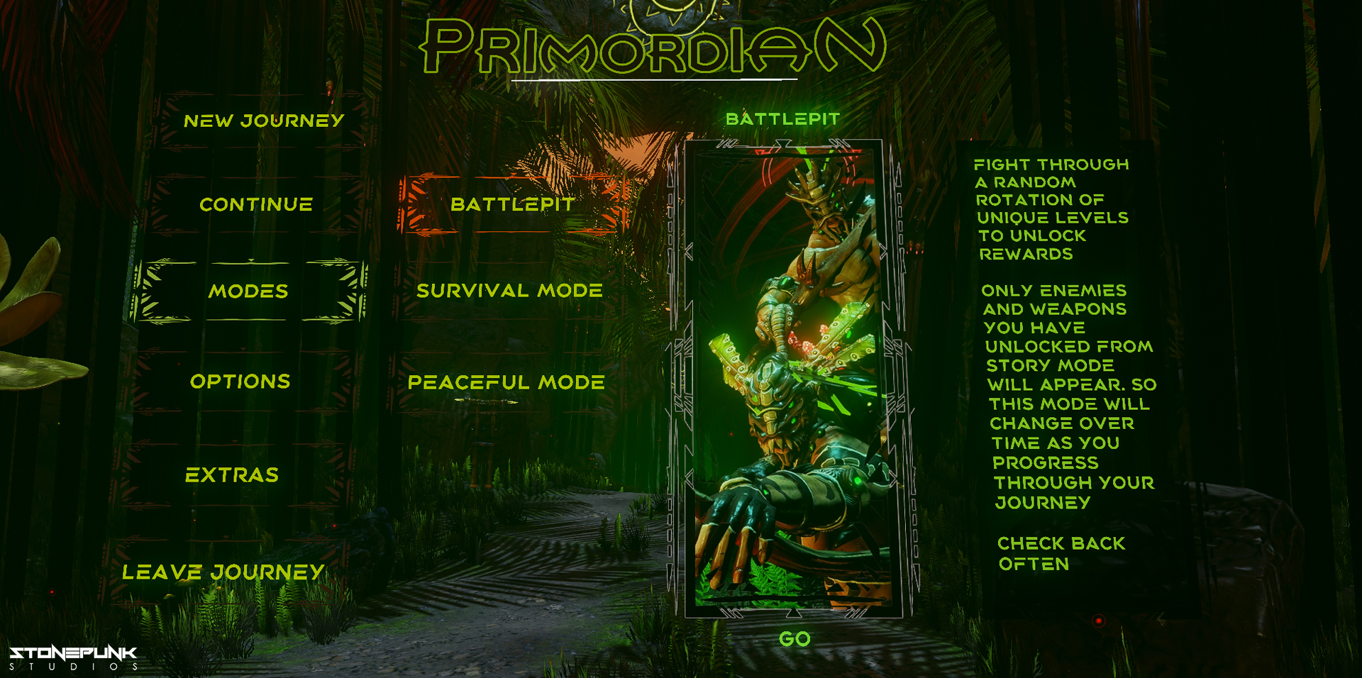 I'm very happy to announce that the new totally reimagined version of Primordian that has been worked on day and night for the last 2 years is finally very close to completion. Within a few weeks from now it will be ready for some beta branch play testing. Feel free to message in the discussion thread for playtesting that you would like to be involved and added to the group, as your feedback and thoughts would be most valuable and very much appreciated. It will be a huge help to make this 7 year journey worth the wait for everyone. ːsteamhappyː Here is an image of the all new menu system that will be included.