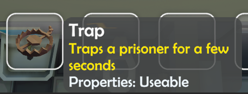 New Item - Trap - Can be placed on the floor as a guard and when a prisoner steps on it, he will be stuck for a few seconds.