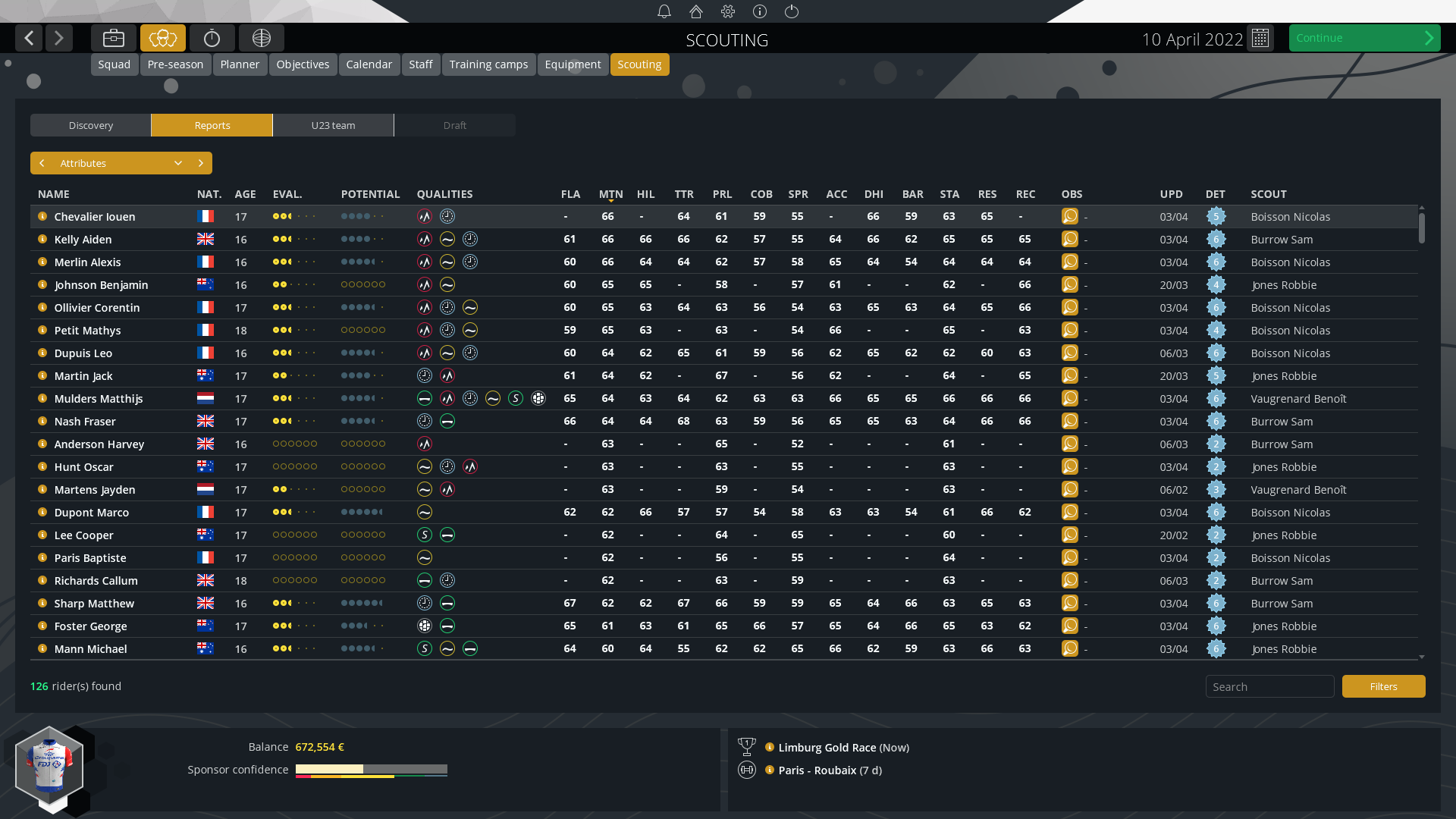 From the outset scouting has been tied to the youth movement that has been obvious in cycling for several seasons. For the game, we decided to stagger the categories by targeting the scouting of junior riders, meaning 17- and 18-year-olds, instead of young hopefuls (19 to 22). After looking at the system used in PCM21, we established several objectives: developing the system, increasing the player’s impact and creating mechanics that add to the game while regularly providing information.