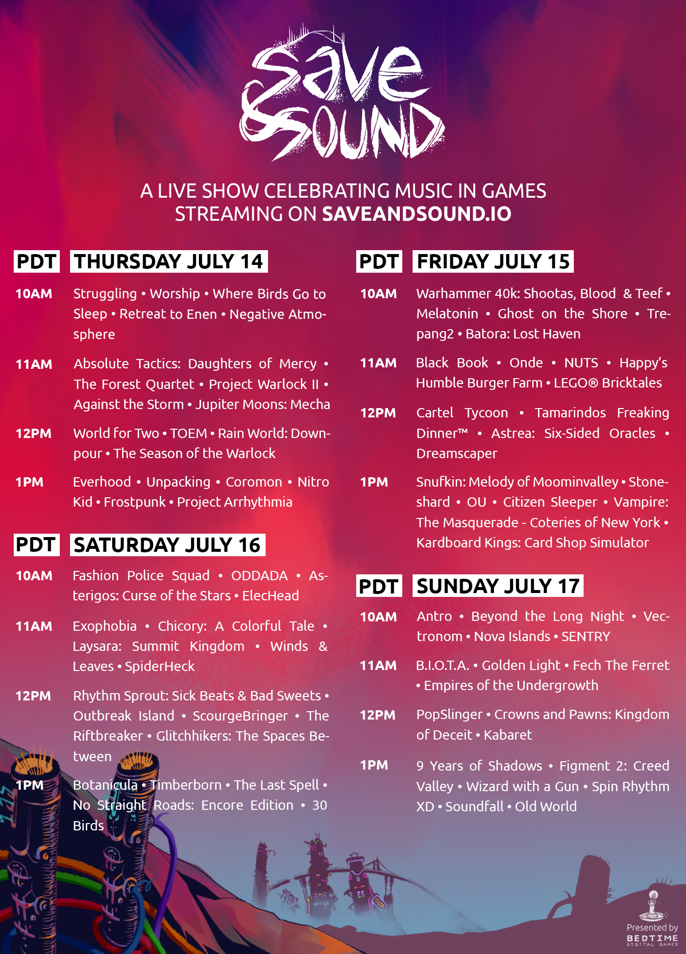 Starting at 10 AM PDT / 7 PM CEST, a 4-day live show from July 14 to 17 will stream showcasing all the wonderful content made just for Save & Sound, including a deep dive into the music of Project Warlock II.