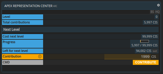 There will be a new command called ARC, where companies can contribute towards the APEX Representation Center. The current level will be visible in the company info command CO.