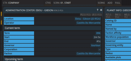 Once a player gets voted into office a new context is available (think 'Government of Promitor', for example). The context can be changed via a drop-down menu, similar to the existing screens drop-down. Once switched to the new context, a default screen greets the new member of parliament. The company-related screens are all hidden, instead the player can create new screens that are relevant for the given context. Using an existing command, for example FINLA, will not show the player's liquid assets, but rather the ones of the government.
