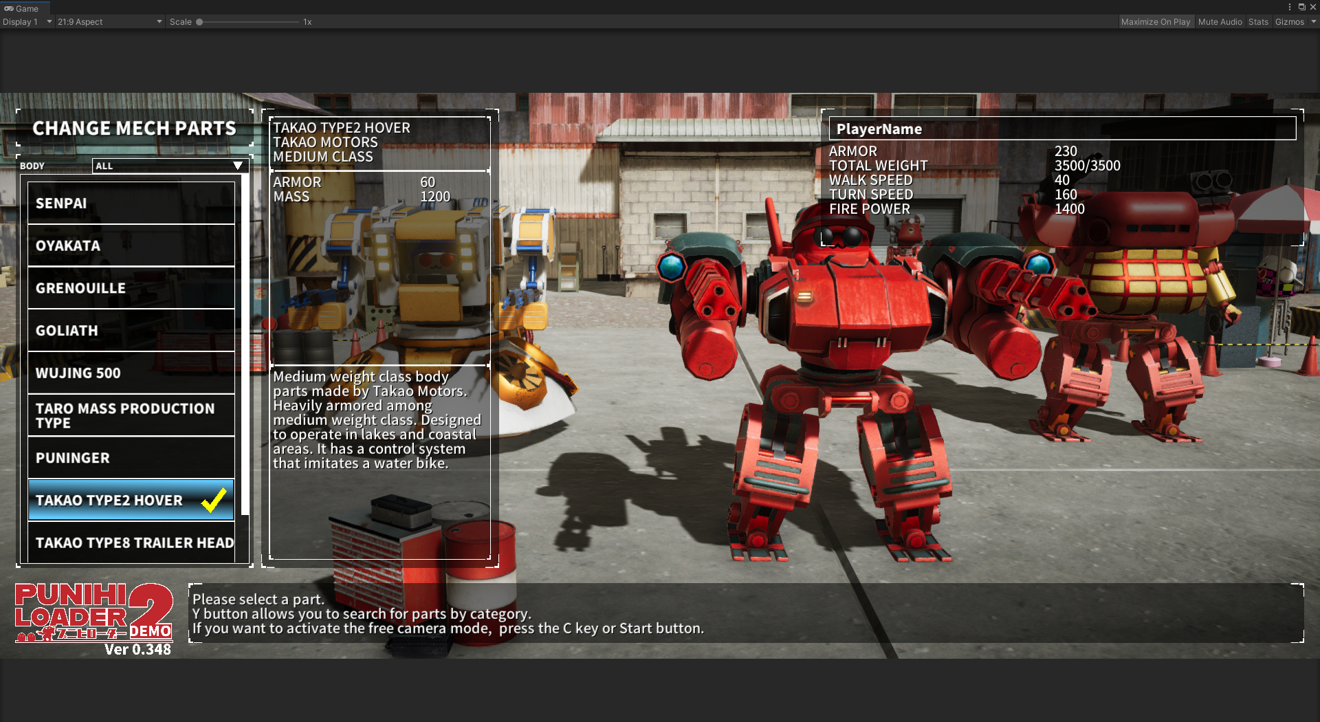 The mechas in the game can be customized as desired by the player. The 10 mechas in the demo version, with a total of 60 parts, all have a unique appearance. The coloring of the mecha can be customized, and the boarding Punihi can be dressed up as well. Combine the 5 mecha parts and dress up your mecha to create unique mechas that look badass, cool, etc.