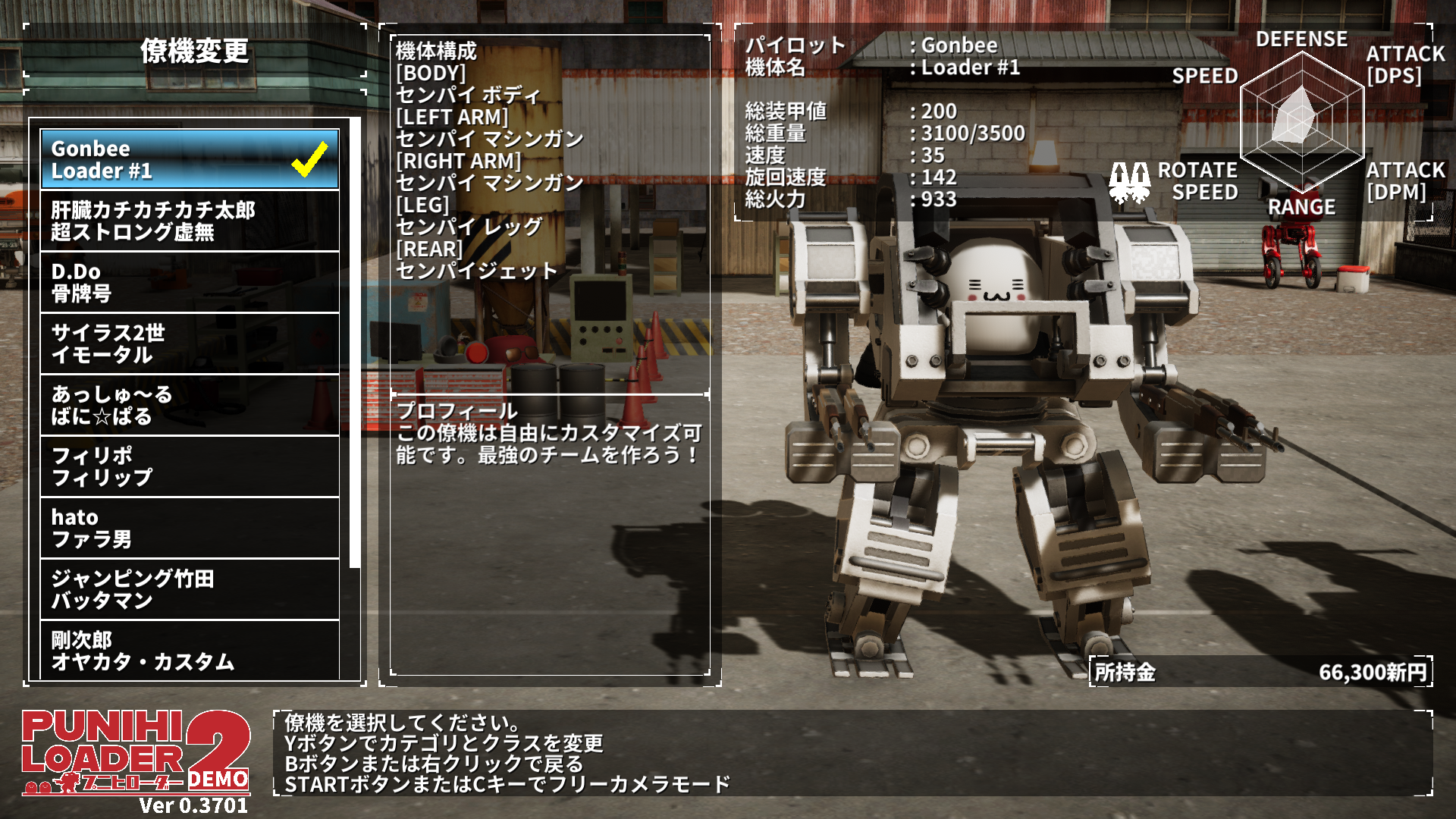 PUNIHI LOADER 2 is a mecha customize shooter in which Punihi a one-headed mysterious creature rides and fights on unique mecha. In Neo Asahikawa, competitions in which the Punihis ride and fight on mecha are very popular. Gather friends, earn funds, and buy mecha parts to reach the top of the "Neo Asahikawa League". This demo version allows players to experience the "Arena" and "Customization," which are the core elements of the game.