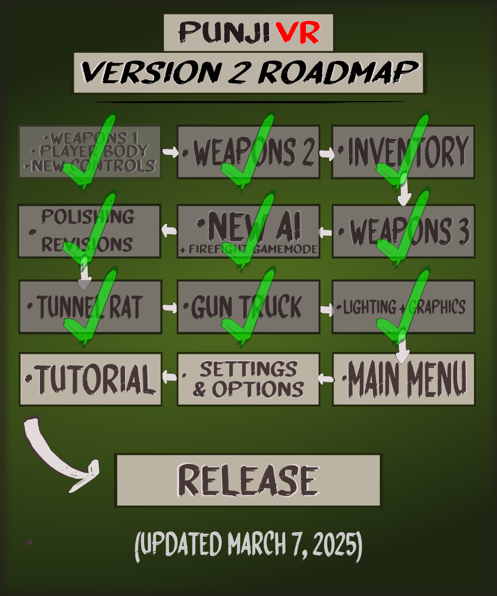 I'm still planning out the roadmap for the updates following Version 2's full launch, so stay tuned for info on that -- and don't hesitate to reach out with suggestions if you have any! The main goal for the first ~year after V2's release will be to get as much content into the base game as possible so that I can afford to spend longer development periods on larger additions, like vehicles, level editors, larger missions, and multiplayer.