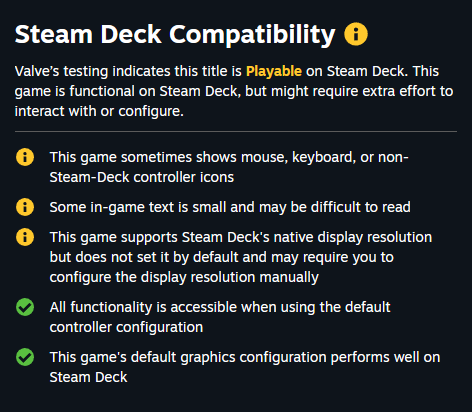 I'll get my hands on a Steam Deck as soon as possible, so that I can do some proper testing while fixing the yellow stuff that prevents it from receiving a perfect "Verified" rating.