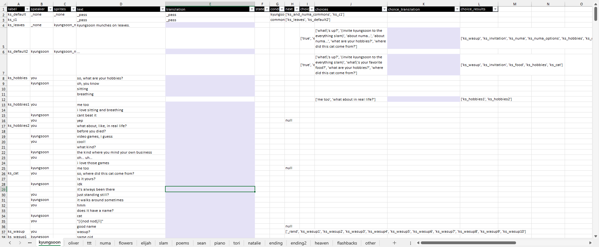 The first 19 tabs include all the dialog and choice text in the game. Fill in the "translation" and "choice_translation" columns. The last 2 tabs contain other text that need to be translated, like the "flashback" scenes, menu options, and Steam page. The spreadsheet is color-coded, so all the cells you need to fill in are highlighted.
