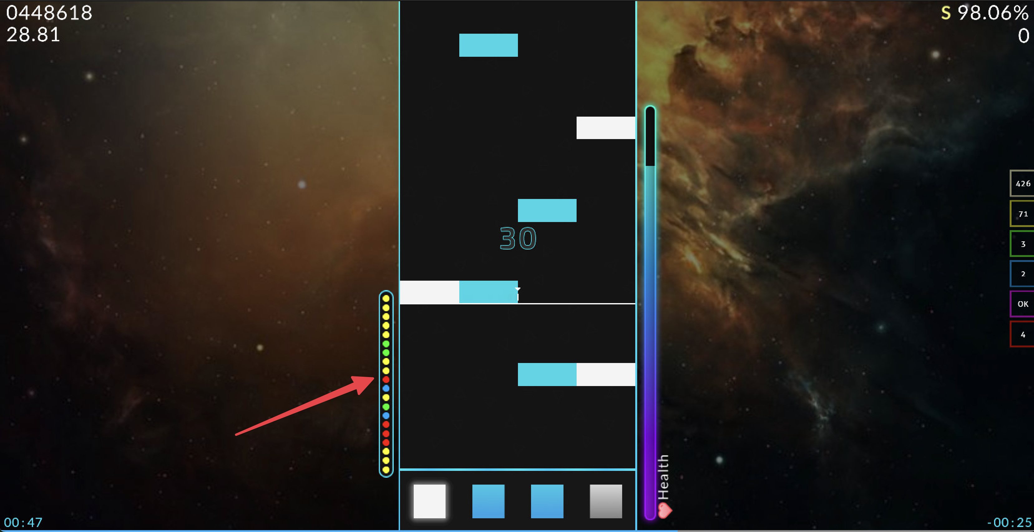 Hit Bubbles are a new skinnable element which displays an ordered version of the previous judgements that were achieved during gameplay.