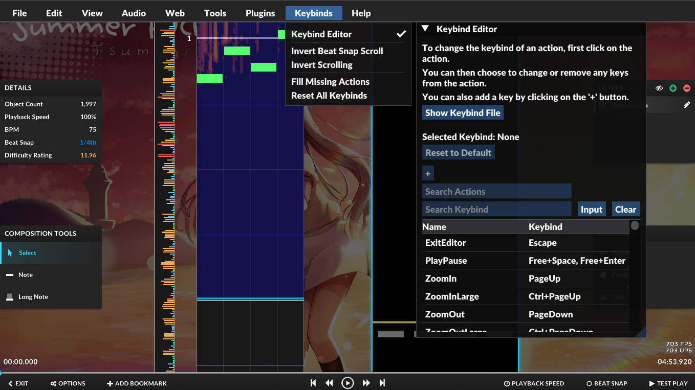 The editor input system has been reworked, so that you could now customize your own keybinds for most of the actions in the editor. You can check this out via the `Keybind Editor`, located under the new `Keybinds` menu: